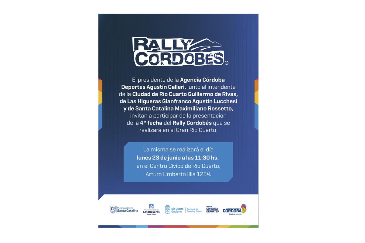 (Córdoba, 22 de junio de 2025). El Rally de Río Cuarto 2025, se presenta oficialmente. La competencia que se disputará del 27 al 29 de junio por caminos aledaños a Río Cuarto, Las Higueras y Santa Catalina – Holmberg, tendrá su lanzamiento con una conferencia de prensa que se desarrollará el próximo lunes a las 11:30, en el Centro Cívico de Río Cuarto.