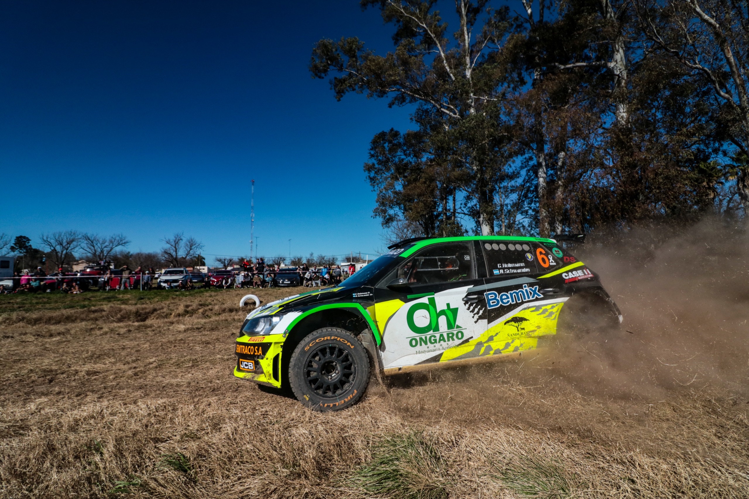(San Francisco, 9 de agosto de 2025). Germán Hubmann/Andrés Schwander (Skoda Fabia Rally2), ante una multitud que disfrutó el paso de los autos, son los líderes de la 6ª fecha del campeonato de Rally Cordobés que se está desarrollando con sede en San Francisco.
